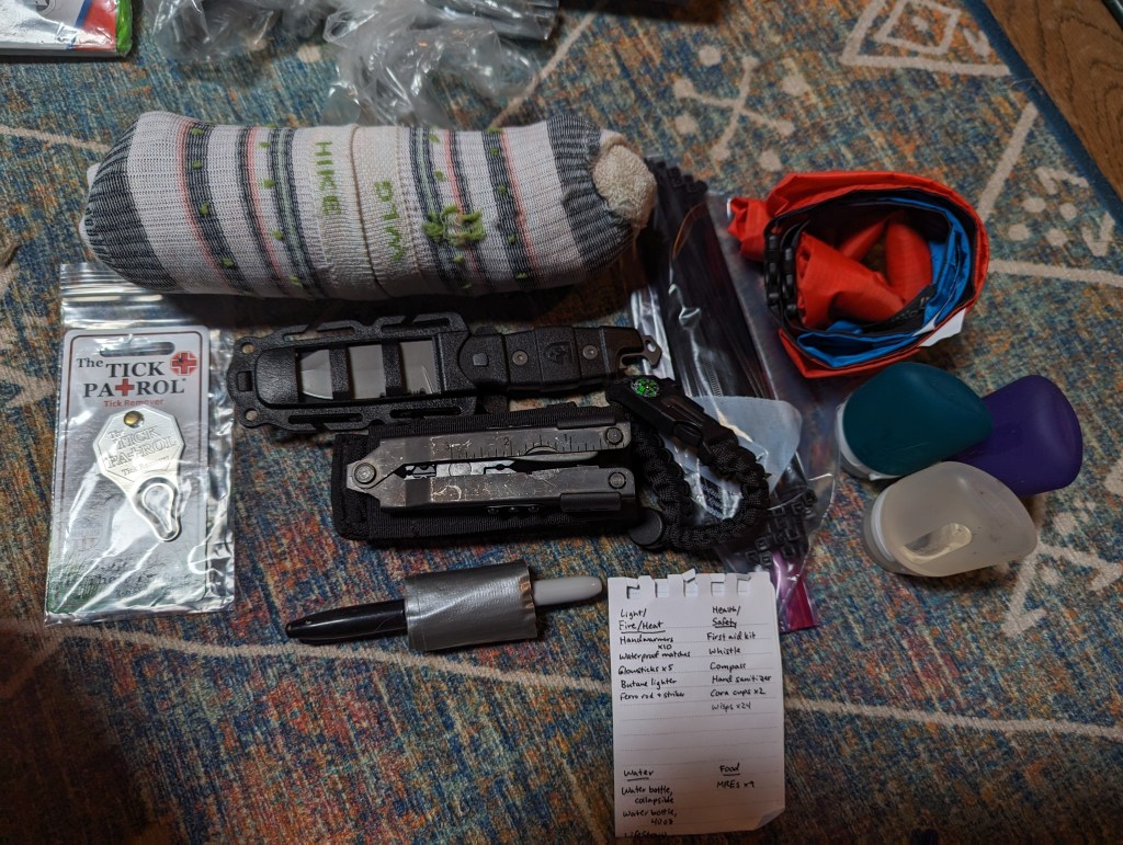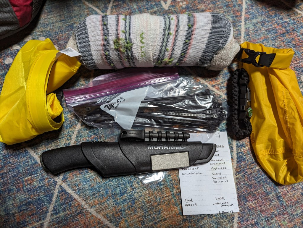 Each bag has a dry sack or two, you never know when you’ll need one of those and they don’t take up much room. Also a bag of zip ties, which could come in handy for attaching various things together, a tick remover tool, and (because I’m a huge nerd) an inventory of what’s in each bag. And there’s a paracord bracelet in each bag, for some extra paracord I guess? Or a fashionable bracelet? Who knows.